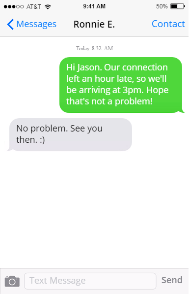 This is especially helpful if you are running late and you know your friend is unlikely to check the flight status before leaving home — a quick “we left an hour late so please don’t leave until 3 p.m.” is definitely the polite thing to do.